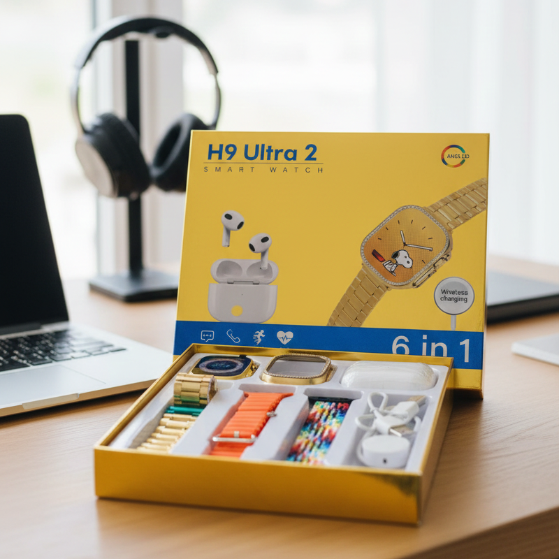 H9 Ultra 2 Smart Watch | Original Full Display | AirPods 3 BT | 6‑in‑1 Set with Cover & Straps